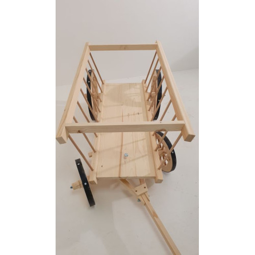 Žebriňák je vyrobený z masívneho smrekového alebo borovicového dreva a má kovové okovanie kolies pre dokonalý vzhľad. Dodáva sa bez povrchovej úpravy, takže si môžete zvoliť vlastný spôsob ochrany dreva. Montáž je jednoduchá – stačí pripevniť oj.