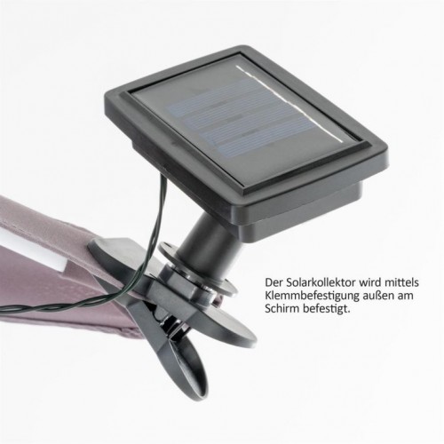 S touto solárnou reťazou vytvoríte pod slnečníkom príjemnú atmosféru. 8 reťazcov môžete pripevniť prostredníctvom dodávaných sťahovacích pásikov k slnečníku, solárny panel svorkou k látke. So súmrakom sa automaticky rozsietia LEDky. Podľa svojej voľby si tiež môžete zapnúť funkciu blikania. Životnosť LED lampy je viac ako 6.000 hodín. Súčasťou balenia je aj kolík na prípadné upevnenie solárneho panela do zeme.