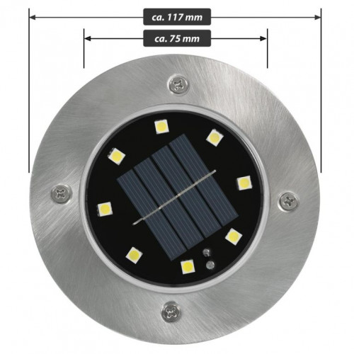 Solárne bodové svietidlo s 8 LED je okrúhle, bezpečné a odolné voči poveternostným vplyvom. Horný krúžok je vyrobený z nerezovej ocele. Senzor automaticky zapne svietidlo za súmraku. Plne nabitý solárny článok zaistí prevádzku po dobu približne 8 hodín. Počas dňa sa integrované batérie dobíjajú prostredníctvom solárnych článkov pomocou solárnej energie. Ideálne pre vjazd do garáže, chodníky, terasy alebo schodíky.