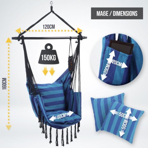Toto visiace kreslo je vyrobené z odolnej zmesi bavlny a polyesteru a má odnímateľné poťahy na vankúše, ktoré je možné jednoducho vyprať v práčke. Údržba tohto visiaceho kresla je naozaj hračkou. Táto visiaca stolička je upevnená na oceľovej roztváracej tyči, vďaka 360° otočnému kĺbu si ľahko nájdete pohodlnú sedaciu pozíciu a užijete si maximálny komfort. Napriek svojmu pohodlnému dizajnu je toto visiace kreslo vyrobené z odolného materiálu, ktorý odoláva každodennému opotrebovaniu a poskytuje dlhú životnosť.