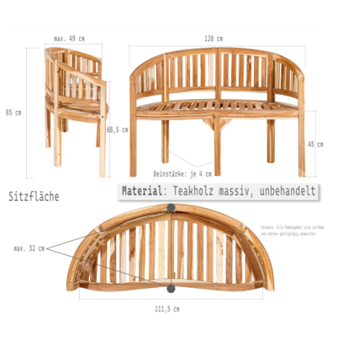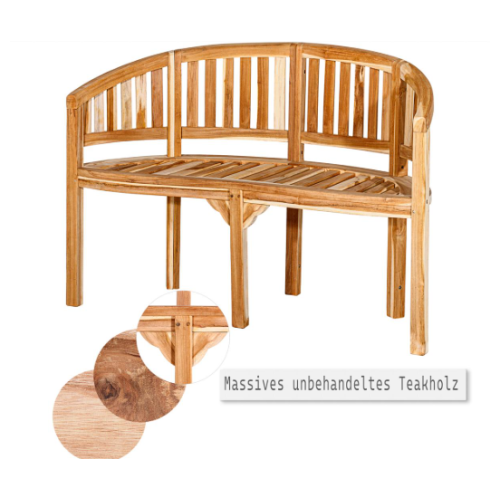 Lavica je vyrobená z brúseného, neošetreného teaku, ktorý je známy svojou pevnosťou a odolnosťou. Masívne komponenty a stabilná konštrukcia zaručujú bezpečné používanie. Údržba je jednoduchá, odporúčame ochranu pred nepriaznivým počasím.