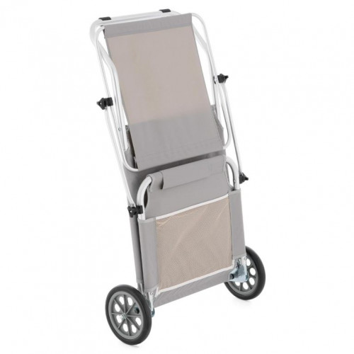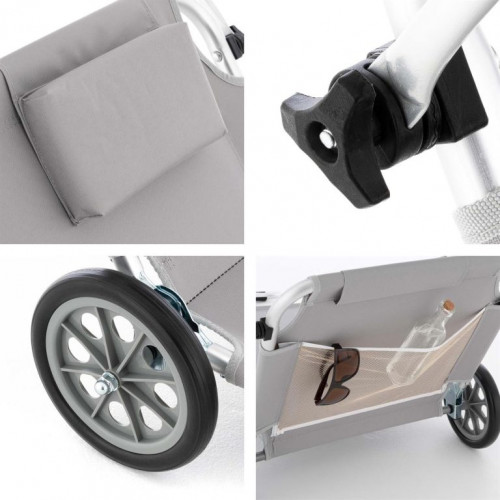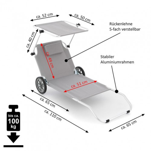 Skrášlite svoju terasu alebo záhradu týmto praktickým lehátkom, ktoré je vhodné na vnútorné aj vonkajšie použitie, k bazénu alebo pri kempovaní. Môže byť použité aj ako prepravná pomôcka pre Vaše plážové náčinie. Slnečnú clonu je možné plynule nastavovať podľa potreby, aby nedošlo k popáleniu. Kvalitný hliníkový rám a rýchloschnúca ležacia plocha odolná proti roztrhnutiu, praktická relaxačná opierka hlavy pre príjemný komfort ležania. Operadlo nastaviteľné v 5-tich smeroch s praktickou sieťovanou priehradkou zaisťuje príjemné pohodlie pri ležaní. Skladacia, pre úsporu miesta - ľahká preprava vďaka 2 stabilným kolieskam.