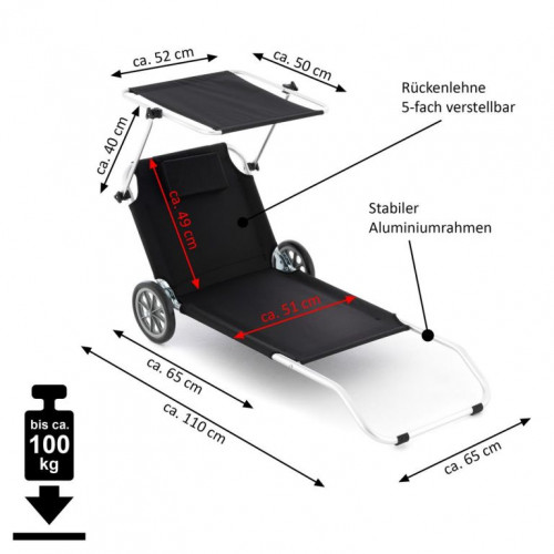 S týmto praktickým lehátkom si môžete skrášliť terasu, balkón, saunu, wellness alebo záhradu. Vhodné na vnútorné i vonkajšie použitie, na použitie pri bazéne alebo na kempovanie. Možno ho použiť aj ako pomôcku na prepravu plážového náčinia. Slnečnú clonu je možné podľa potreby plynule nastavovať, aby nedošlo k úpalu. Vysoko kvalitný rám, rýchloschnúca ležacia plocha odolná proti roztrhnutiu, praktický relaxačný vankúšik pod hlavu pre príjemné ležanie, to všetko sú vlastnosti tohto lehátka. Príjemné pohodlie pri ležaní zaisťuje operadlo nastaviteľné v piatich smeroch s praktickou priehradkou zo sieťoviny. Priestorovo úsporné skladanie - jednoduchá preprava vďaka 2 stabilným kolieskam.