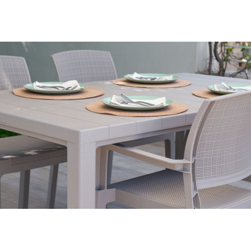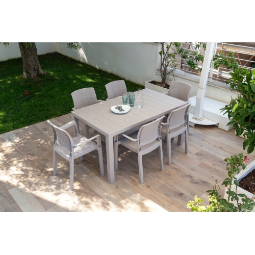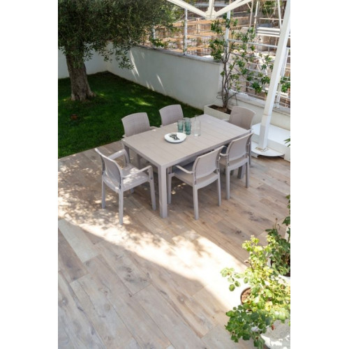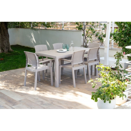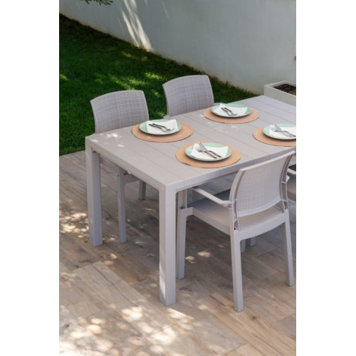 Vďaka svojmu imitovanému drevenému povrchu sa obdĺžnikový stôl stáva neodolateľným kúskom nábytku pre Vaše vonkajšie priestory. S dostatočným priestorom pre 4 až 6 osôb predstavuje ideálne miesto na stretnutie s rodinou a priateľmi.