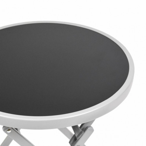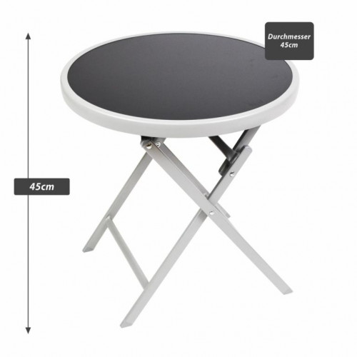 Tento praktický okrúhly odkladací stolík so sklenenou doskou a skladacím stabilným rámom je ideálny na uskladnenie nápojov a potravín vo Vašej záhrade na balkóne alebo terase. Stôl je extrémne stabilný a má priestrannú plochu s priemerom 45 cm. Skladací rám zaisťuje zvláštnu stabilitu. Stôl je odolný voči poveternostným vplyvom a ľahko sa udržuje. Tento vizuálne neobvyklý kovový stôl je ideálnym doplnkom vašej záhrady či balkóna.