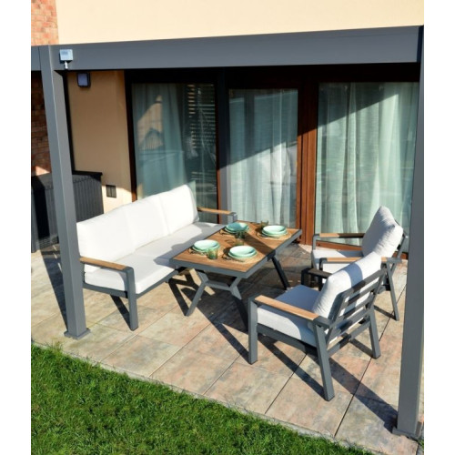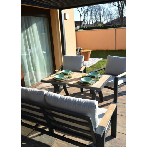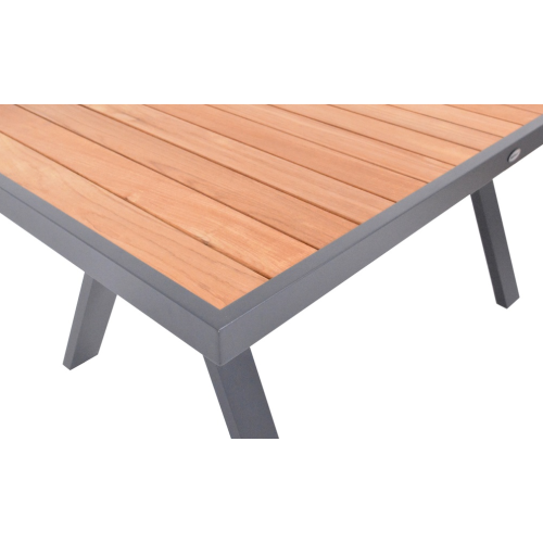 Vytvorte si príjemné miesto na stolovanie s týmto moderným jedálenským stolom z hliníka a teaku. Elegantný grafitový dizajn sa hodí do každého priestoru a vďaka kvalitným materiálom bude stôl slúžiť dlhé roky.