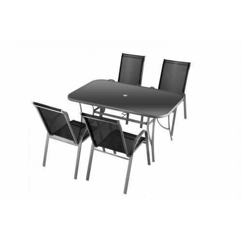 Tento luxusný záhradný nábytok je ideálny do záhrady alebo na terasu. Táto kompletná sada pre štyri osoby sa skladá zo stolu a štyroch stoličiek. Rám je vyrobený z lakovanej ocele. Pre maximálne pohodlie je stolička vybavená opierkami po ľavej a pravej strane. Pre ušetrenie miesta je možné stoličky naskladať na seba. Použité materaiály sú bezúdržbové, odolné voči poveternostným vplyvom a nevyžadujú špeciálnu starostlivosť.