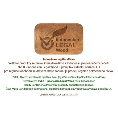 Drevo je odolné voči vplyvom počasia, vodeodolné a neštiepi sa (triesky). Na neošetrenom dreve sa postupom času vytvorí sivá patina. Drevo sa vyznačuje vysokou odolnosťou voči plesniam, hmyzu a chemikáliám. Vďaka týmto vlastnotiam je veľmi obľúbené a často sa používa na výrobu nábytku do vonkajších priestorov. Všetky DIVERO drevené produkty pochádzajú z Indonézie a sú vybavené SVLK - Indonesien Legal Wood pečaťou. Tým je zaručené dodržiavanie aktuálnej smernice EÚ ohľadom obchodu s drevom, ktorá má zabrániť importu ilegálne vyrúbaných stromov.