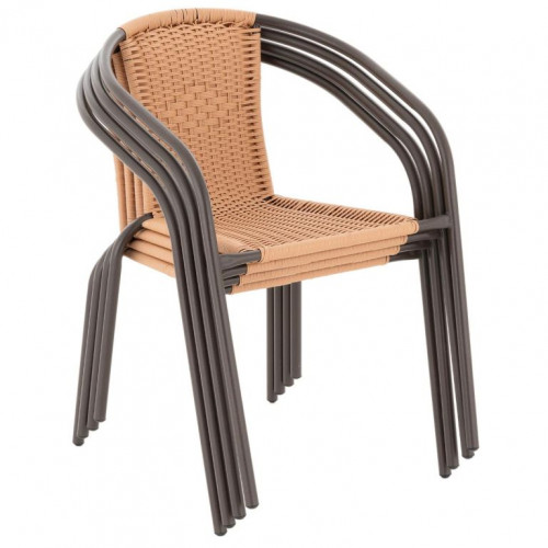 Ľahký, ale napriek tomu vysoko stabilný bistro stolík má zaujímavo vzorovanú sklenenú dosku s otvorom na slnečník a oceľový lakovaný rám. Rám stohovacej stoličky je vyrobený z práškovo lakovanej ocele s tepaným vzhľadom. Svetlo hnedý polyratan je vyrobený z plastu, je odolný proti roztrhnutiu a zaujímavo tkaný. Stoličky môžete naukladať na seba a ušetriť tak veľa miesta, pokiaľ chcete sadu uskladniť na zimné mesiace. V prípade potreby ho samozrejme môžete použiť aj ako balkónové kreslo, záhradné kreslo. Nohy stoličiek majú gumové výstupky/gumové krytky. Nohy stola i stoličiek sú opatrené protišmykovým materiálom. Použité materiály sú veľmi odolné voči nepriaznivému počasiu, nevyžadujú údržbu ani špeciálne čistiace prostriedky.