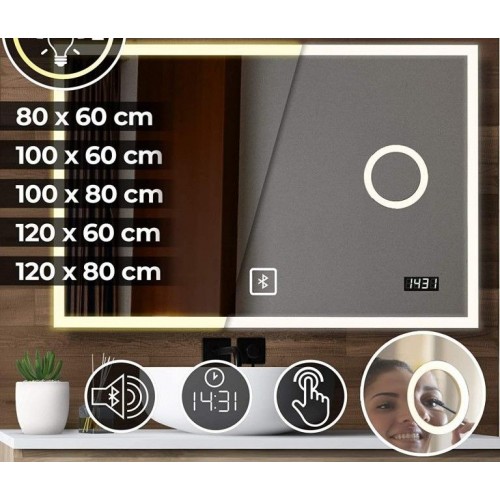 Toto kúpeľňové zrkadlo s osvetlením má digitálne hodiny a bluetooth reproduktor rovnako ako kozmetické zrkadlo. Dotykové zrkadlo poskytuje špeciálne okolité osvetlenie, ktoré zodpovedá vašej nálade. Nastaviteľné od teplého po studené svetlo. Toto zrkadlo je bez medi a je obzvlášť odolné proti vlhkosti. Pri každom rozsvietení zrkadla sa ozve zvukový signál.