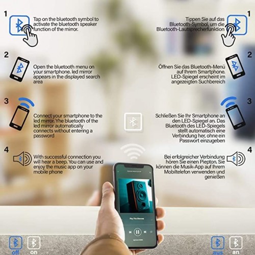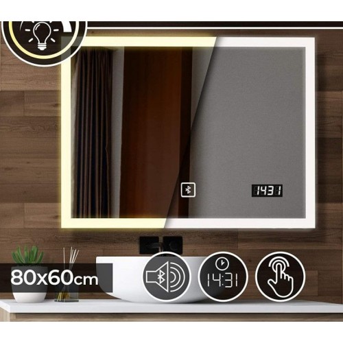 Toto osvetlené kúpeľňové zrkadlo má digitálne hodiny a bluetooth reproduktor. Zrkadlo ovládané dotykom poskytuje špeciálne osvetlenie okolitého prostredia, ktoré zodpovedá vašej nálade. Nastaviteľné od teplého po studené svetlo. Toto zrkadlo je bez medi a je obzvlášť odolné proti vlhkosti.